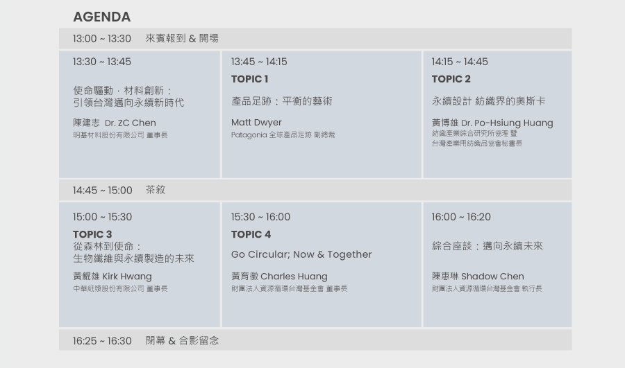 我們非常榮幸邀請到 Patagonia 全球產品足跡副總裁 Matthew Dwyer 擔任論壇主講人之一。Patagonia 長期以來被視為全球永續發展的領導品牌,在本次論壇中,他將以以下主題分享深刻見解: